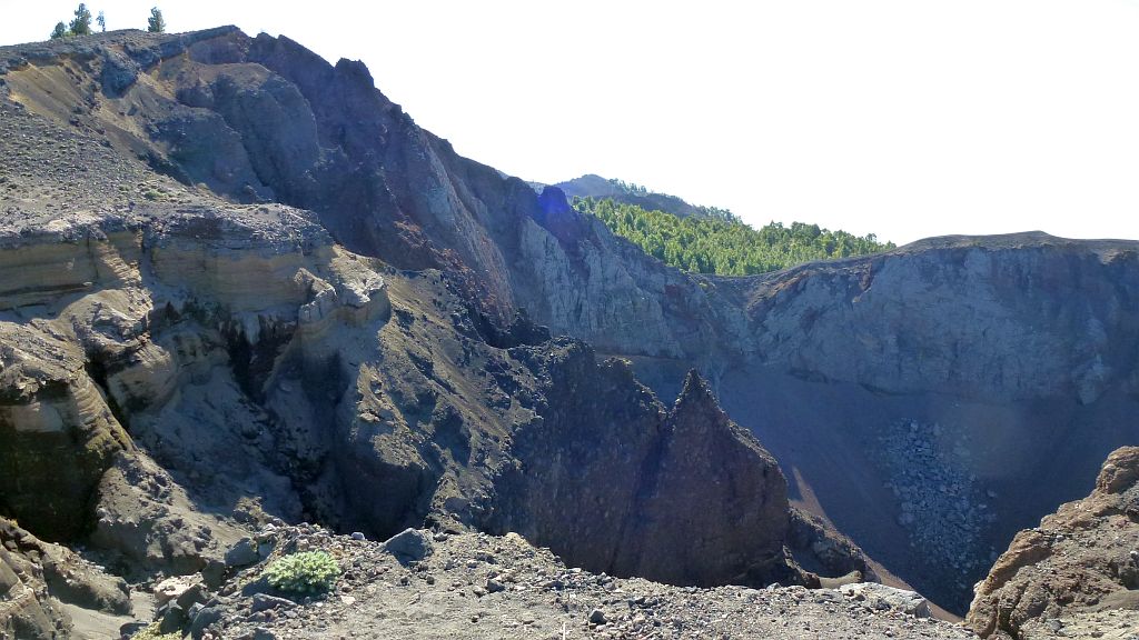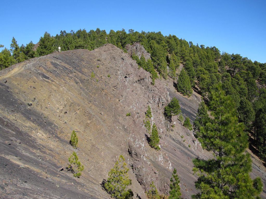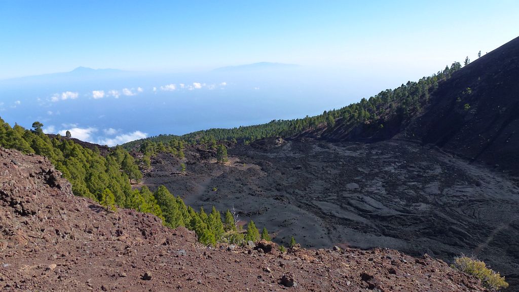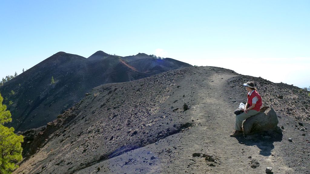 Bald haben wir den ersten größeren Vulkankegel umwandert, der nächste Kegel wird aber nicht mehr umgangen, sondern bestiegen, was bei klarem Wetter den Vorteil hat, daß man einen ersten Blick auf Teneriffa und den Teide werfen kann, dieses Jahr – sehr ungewöhnlich für Januar – ganz ohne Schnee!
