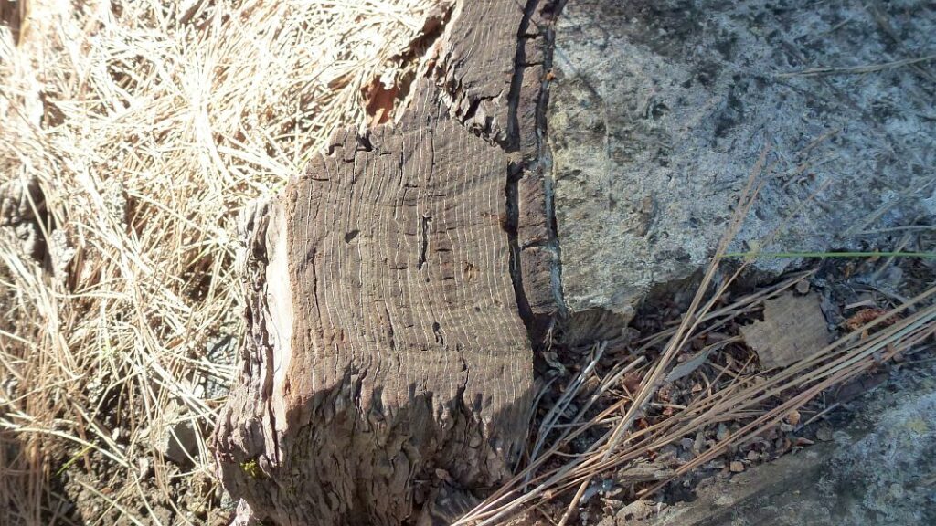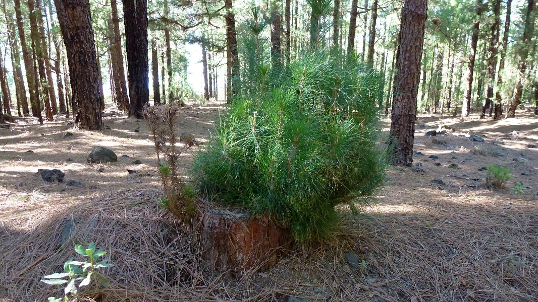 Der Kiefernwald am Anfang der Strecke hat noch Winter und man geht über einen zentimeterdicken Teppich aus den extrem langen Nadeln der kanarischen Kiefer. Diese ist in vielerlei Hinsicht ein Phänomen, denn nur wenige Pflanzen haben so einen ausgeprägten Überlebenswillen. Ausgestattet mit einer sehr dicken Rinde (die Rinde auf der unten abgebildeten Baumscheibe ist 14cm dick) ist der Baum durch Feuer kaum zu vernichten. Bei einem der im Sommer nicht seltenen Waldbrände, verbrennen Nadeln und dünnere Äste – der Stamm bleibt schwarz – scheinbar verkohlt – wie ein Telegrafenmast stehen – um im Folgejahr an dem verkohlten Pfahl erneut auszutreiben!