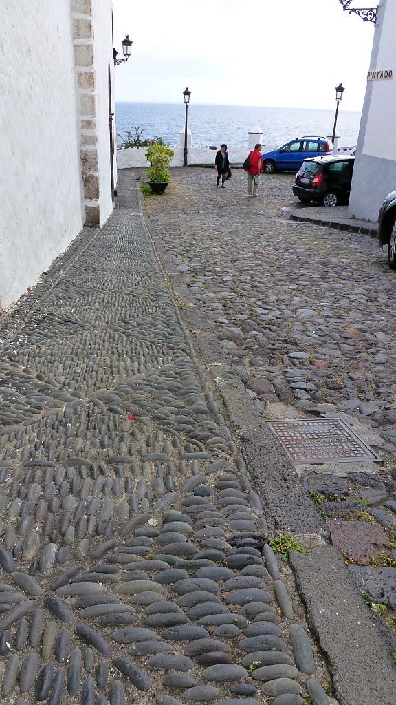Hier sind noch die meisten ‘Fahrbahnen’ mit Vulkan-Bruchsteinen gepflastert und die Bürgersteige kunstvoll mit flachen ‘Bachsteinen’ (die natürlich auch von den Stränden stammen) in Mustern gelegt…