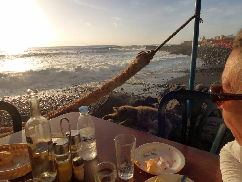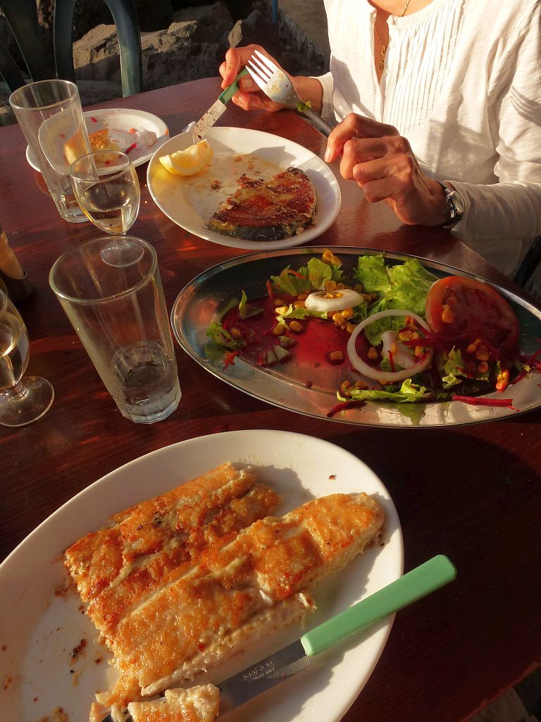 Abends sind wir dann wieder ‘drüben bei uns’ auf der Westseite und kämpfen uns im Sonnenuntergang tapfer durch die Riesen-Fischportionen, die anscheinend auch die Katze schon überfordert haben…
