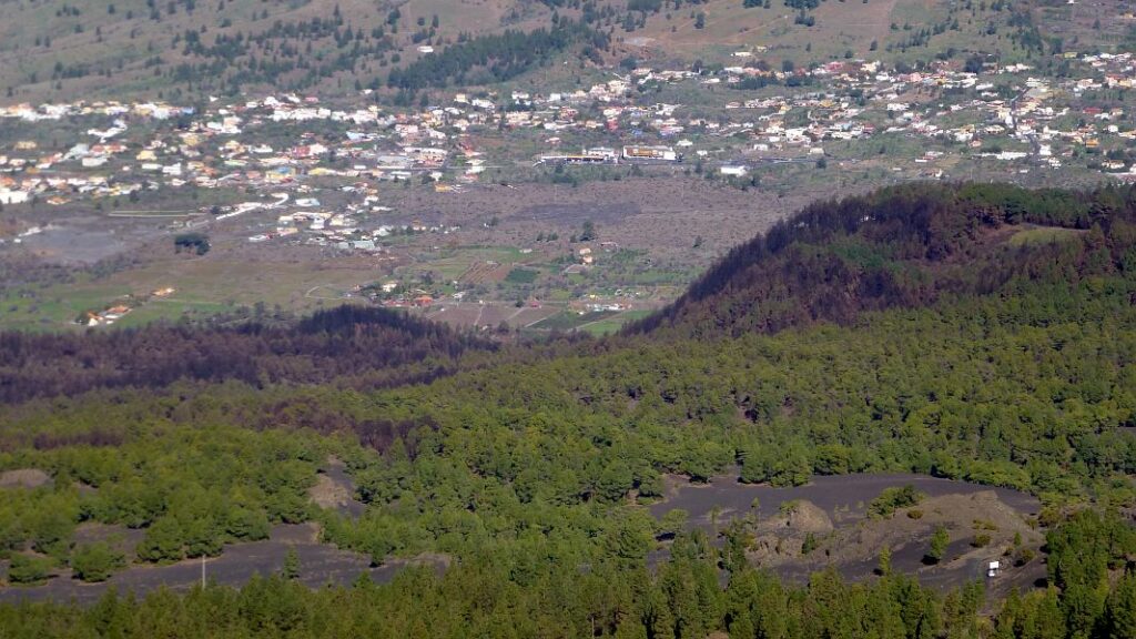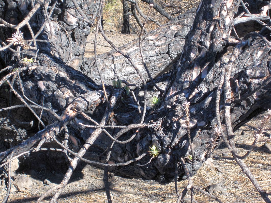 Weithin sichtbar sind die verbrannten Gebiete, die sich durch die Wälder ziehen, nur von nahem sieht man, daß die Regeneration aber bereits im Gange ist…