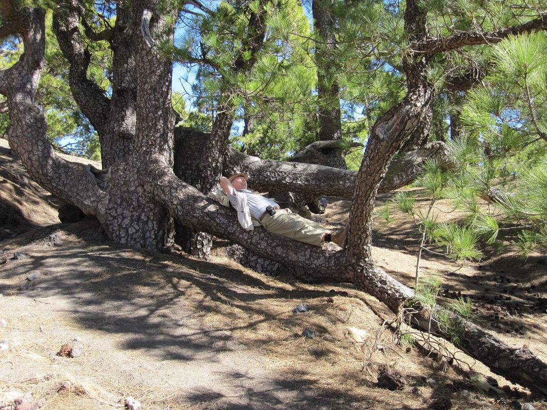 Auf dem Rückweg gibt es eine Rast an einer der kurios verwachsenen, uralten kanarischen Kiefern…