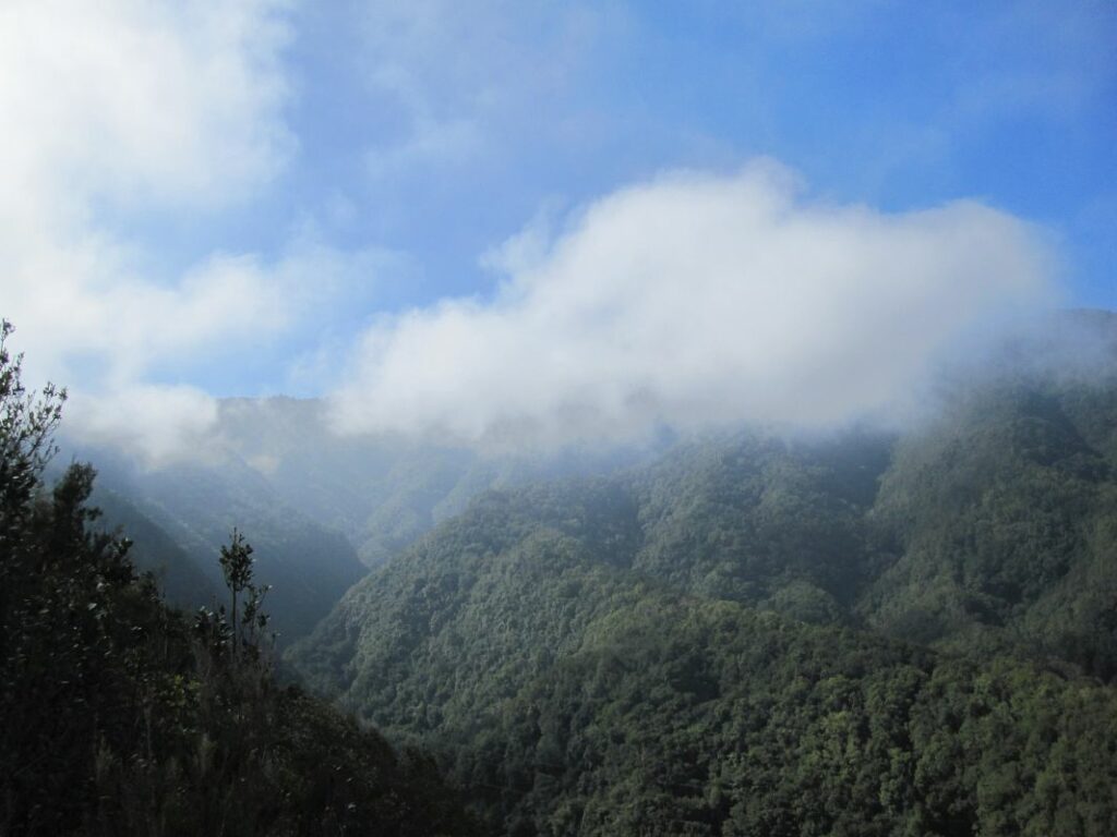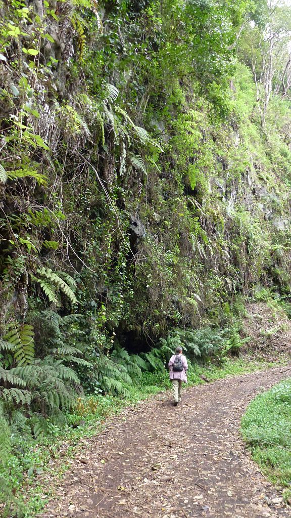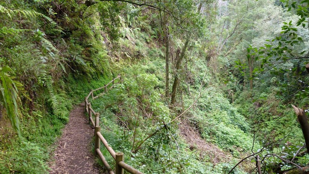 Da der Wetterbericht für nächste Woche auf der Ostseite eine höhere Regenwahrscheinlichkeit voraussagt, entschließen wir uns, dem Regenwald heute einen Besuch abzustatten, solange es noch nicht zusätzlich von oben gießt. Am Cubo De La Galga gibt es einen Infokiosk mit Parkplatz, wir fahren aber ein Stück über die asphaltierte Straße zur Schlucht und parken dort am Rand. Von hier geht es zu Fuß und bereits dieser Anfang ist sehr beeindruckend…