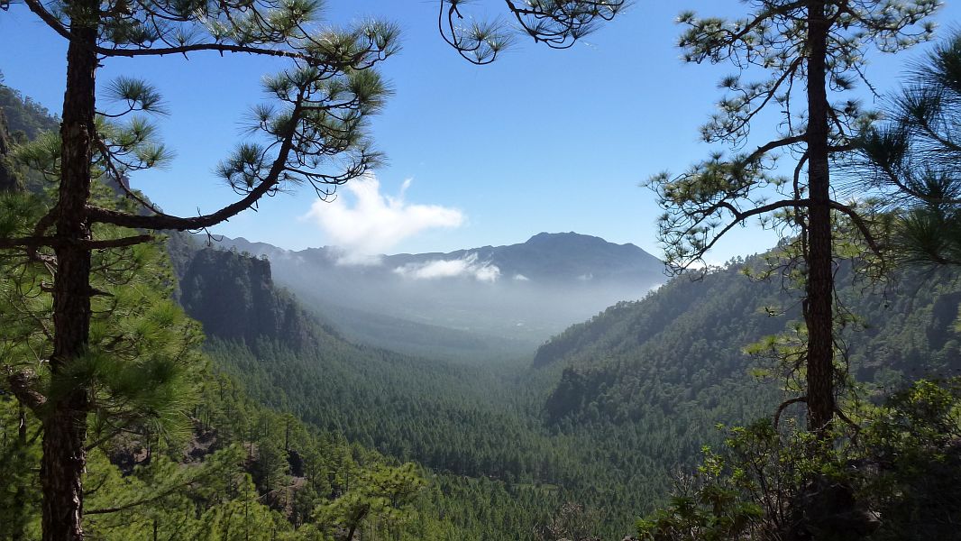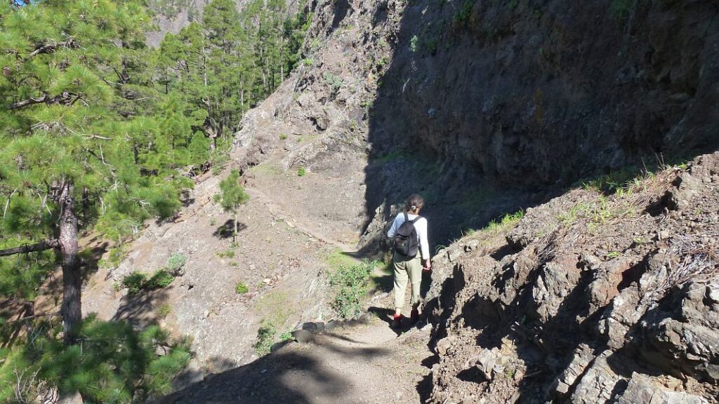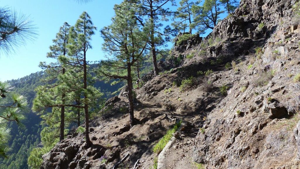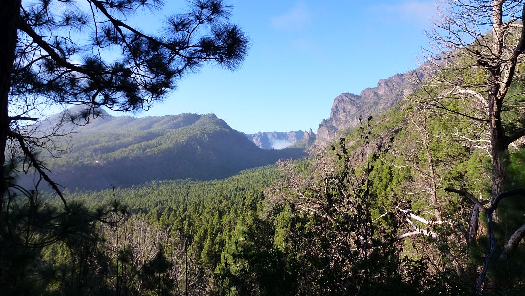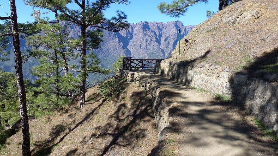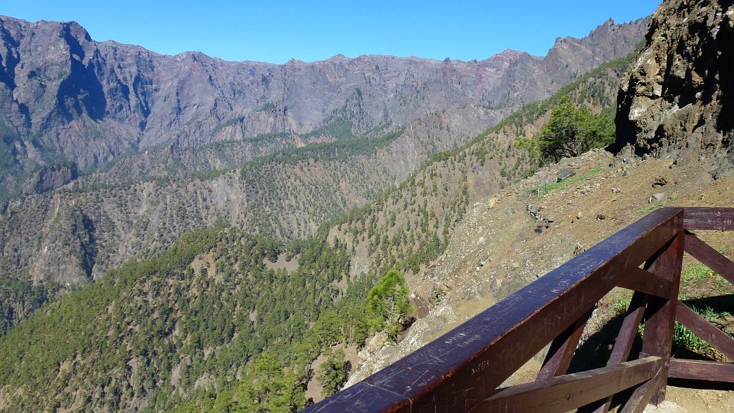 Von hier aus dauert es aber immerhin noch eine Stunde, bis wir die erste Aussichtsplattform an der Cumbrecita erreichen, von der aus man in die Caldera und auf das Bergmassiv des Roque De Los Muchachos schauen kann…