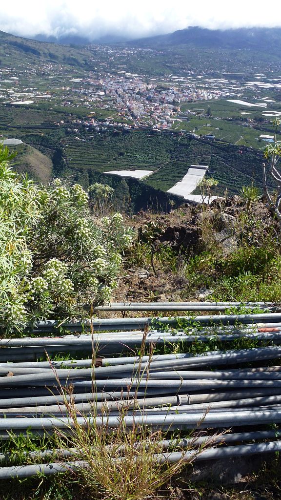 Diesen relativ ‘unkomplizierten’ Wegen des palmerischen Wassernetzes begegnet man immer mal wieder auf den Wanderstrecken, hier z.B. ein Blick auf Los Llanos, im Vordergrund die Zuleitungen für die näheren Gärten und Plantagen…das ist so fertig!