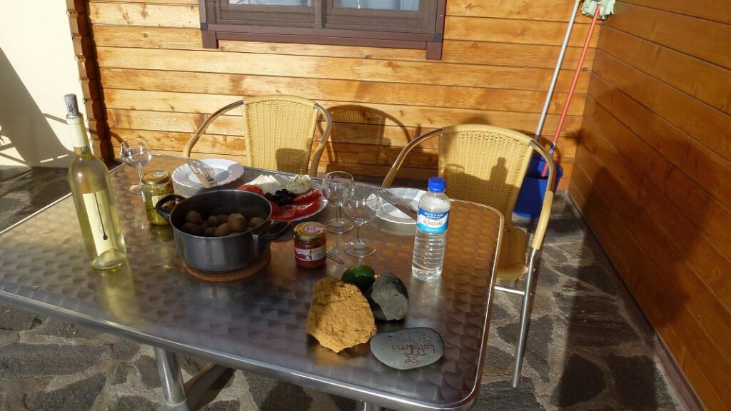 …um ein letztes Reste-Vernichtungs-Abendessen auf der Terrasse einzunehmen (auch wenn die selbstgemachte Mojo natürlich besser ist als die hier auf der Insel überall angebotene fertige aus dem Glas)