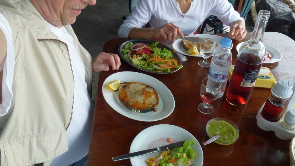 Jetzt hilft nur noch eines: wir brauchen ein Abendessen in der Fischkneipe am Meer…die gibt es wenigstens noch und die Thunfischsteaks sind auch nicht kleiner geworden…