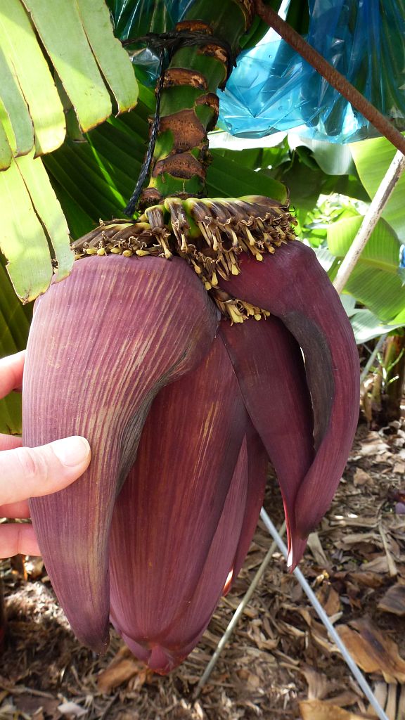 Der letzte Abschnitt führt wieder durch eine Bananenplantage. Zum Teil sind oben die Stauden bereits erntefertig in Folie verpackt, während unten noch die riesige Scheinblüte hängt…