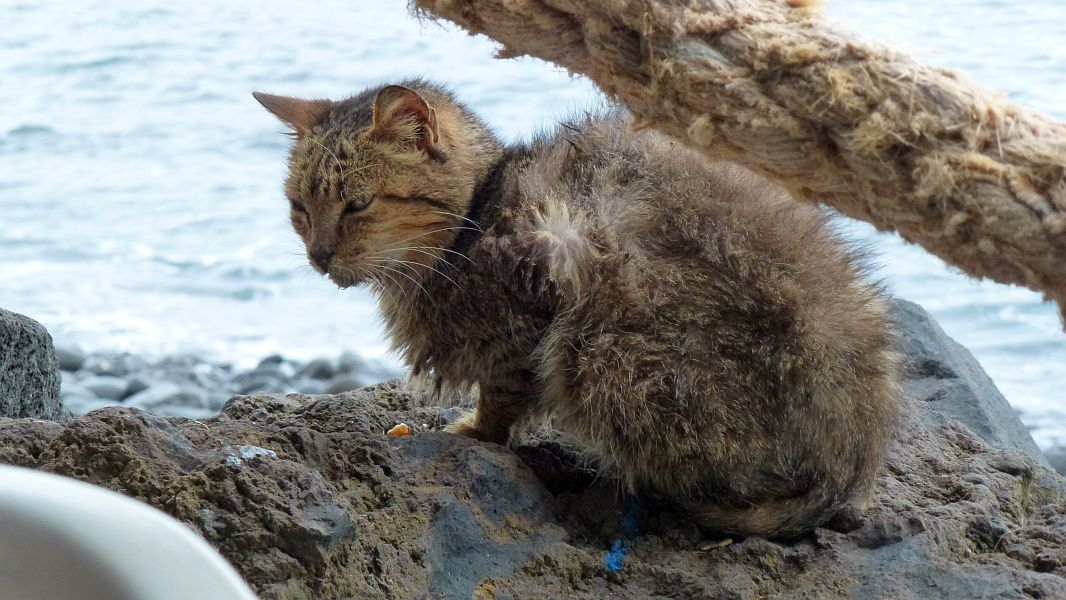 Beim Abendessen in unserer Fischkneipe leistet uns ein etwas zerzauster Streuner Gesellschaft, der zwar gelegentlich auf unseren Fisch schielt, aber offenbar doch nicht hungrig genug ist, um dafur extra aufzustehen…