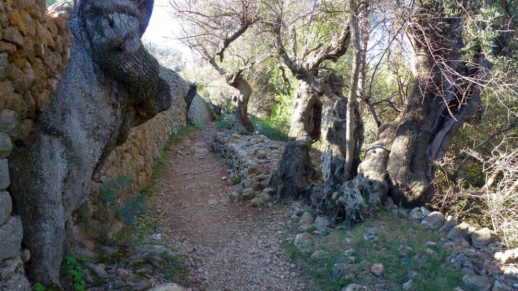 Der Weg beginnt vergleichsweise komfortabel zwischen alten Johannisbrot- und Olivenbäumen, die auch gut in die Theaterkulisse für ein Märchen passen würden…
