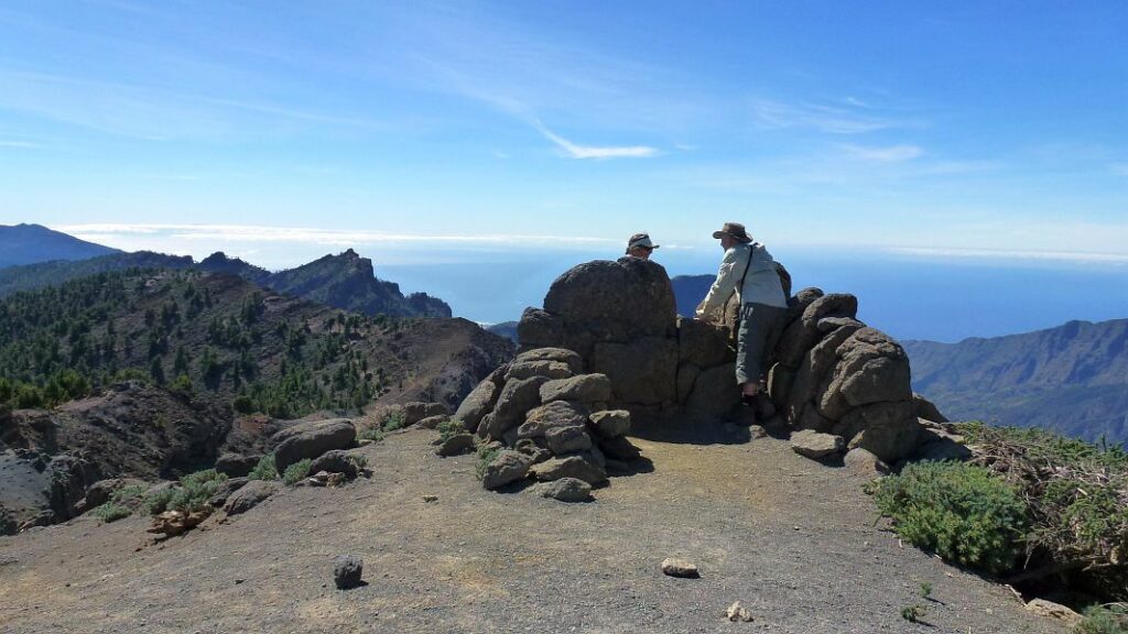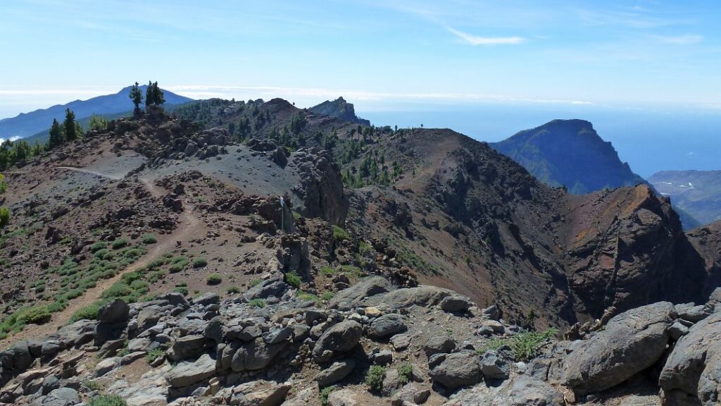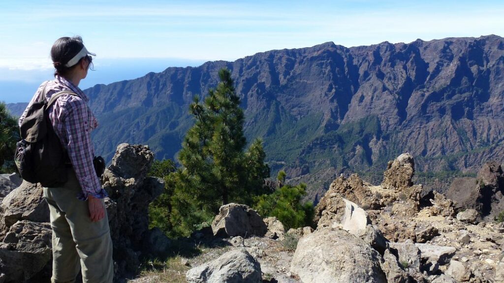 Oberhalb der 2000m Grenze ist der Kiefernbewuchs hier nicht mehr so dicht und es bietet sich ein traumhafter Blick auf die Insel, in die Caldera und auf das gegenüberliegende Felsmassiv des Roque de los Muchachos.