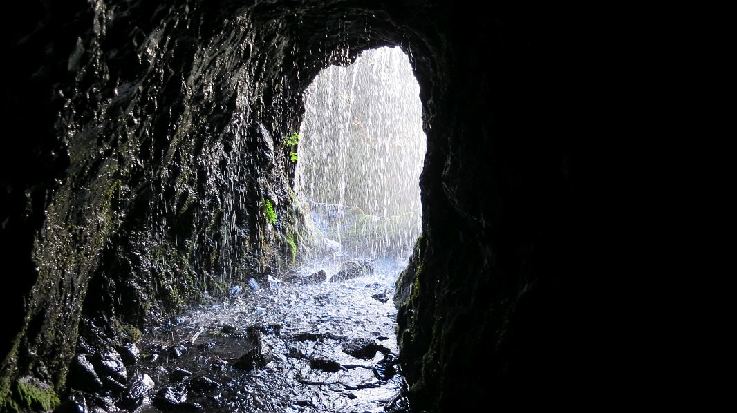 Im Tunnel 12 regnet es überall von der Decke und auch von den Seiten schießt das Wasser ein, was wir aber vorher wußten und weshalb wir einen Regenschutz dabei haben…