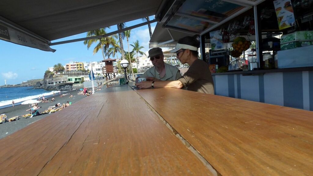 Anschließend fahren wir nach Puerto Naos, um noch ein paar Kleinigkeiten einzukaufen, denn in dem Touristenort haben die Geschäfte auch sonntags geöffnet und einen Kaffee gibt es an Strand auch.