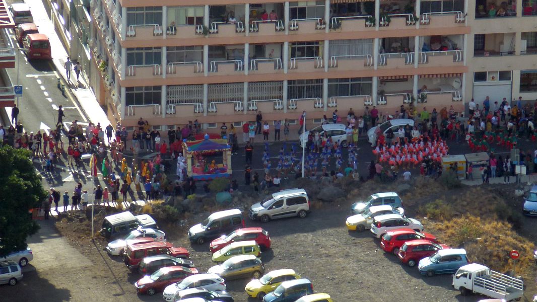 Gegen 17:00 Uhr fängt dann der Umzug mit dem Getrommel an, das wir schon vom letzten Jahr aus Los Llanos kennen, nur ohne die Talkumgebläse…