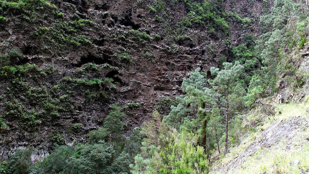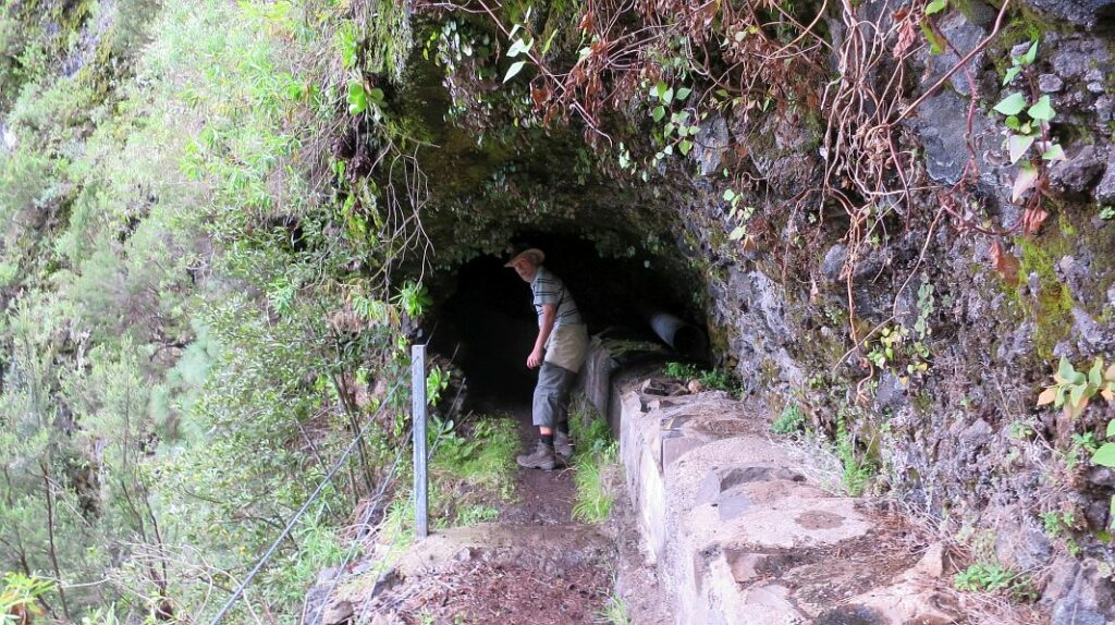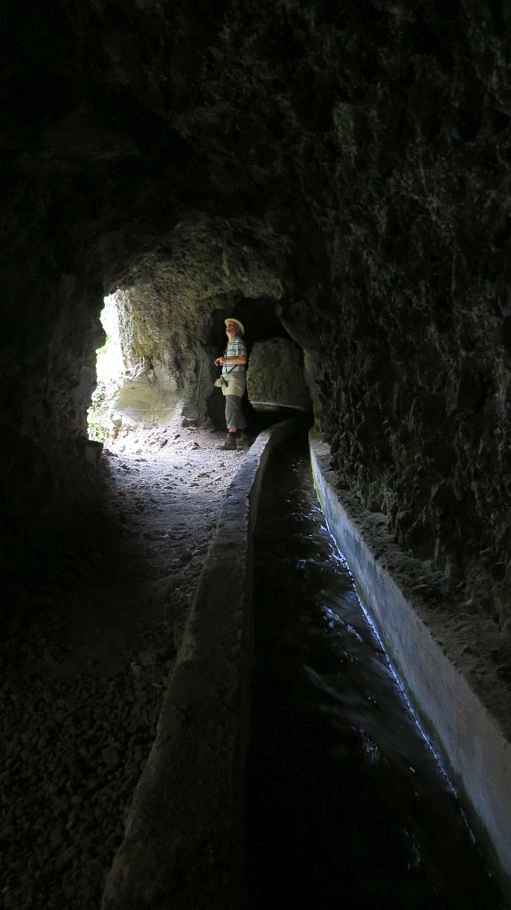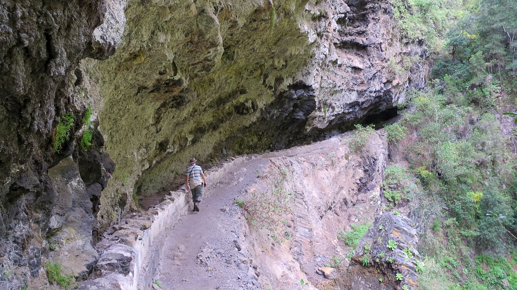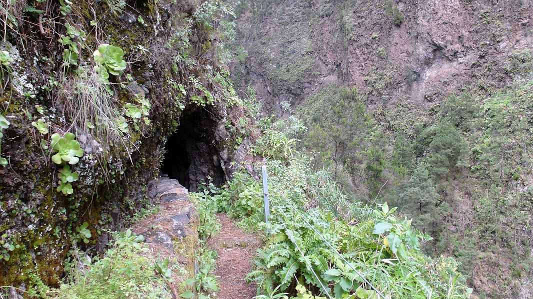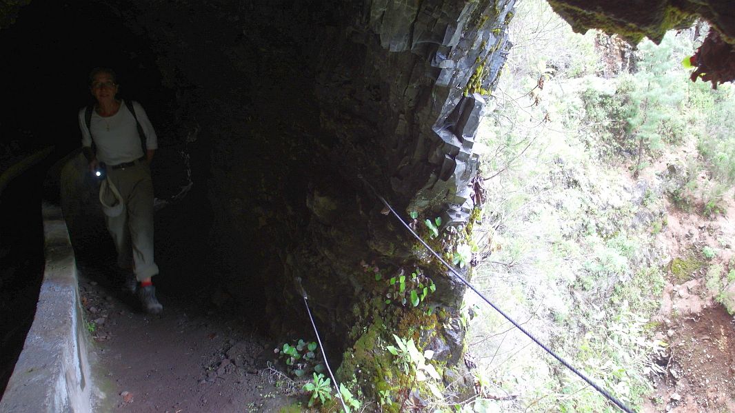 Während es recht nahe am Abhang immer höher hinauf geht, kann man auf der anderen Seite des Barrancos bereits die ‘Fenster’ des ersten Tunnels sehen, durch den unser Weg führt.