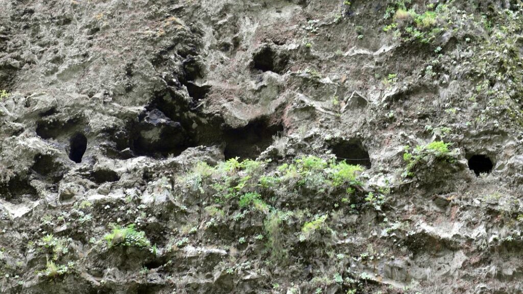 Als wir die Arbeiter fragen, ob die Strecke geschlossen sei, sagt man uns allerdings nur, daß sie – auch aufgrund der von ihnen verursachten Ausschachtungen – ziemlich gefährlich sei… aber nicht geschlossen. Also gehen wir weiter und nachdem wir die doch nicht so gefährliche Baustelle hinter uns gelassen haben, erreichen wir bald den ersten beeindruckenden Felsüberhang, den man für die – auch hier noch abgedeckte – Wasserleitung geschaffen hat.