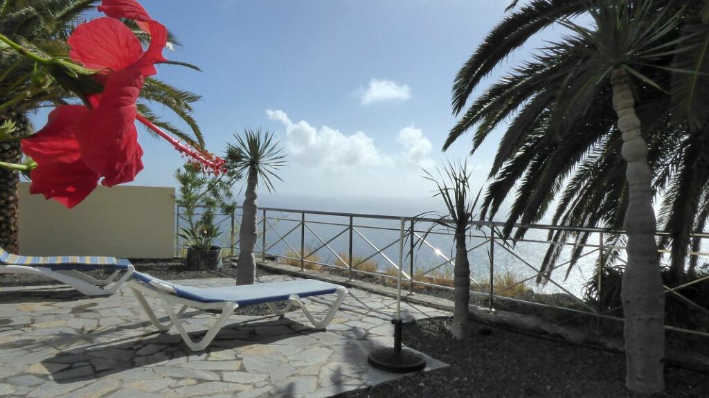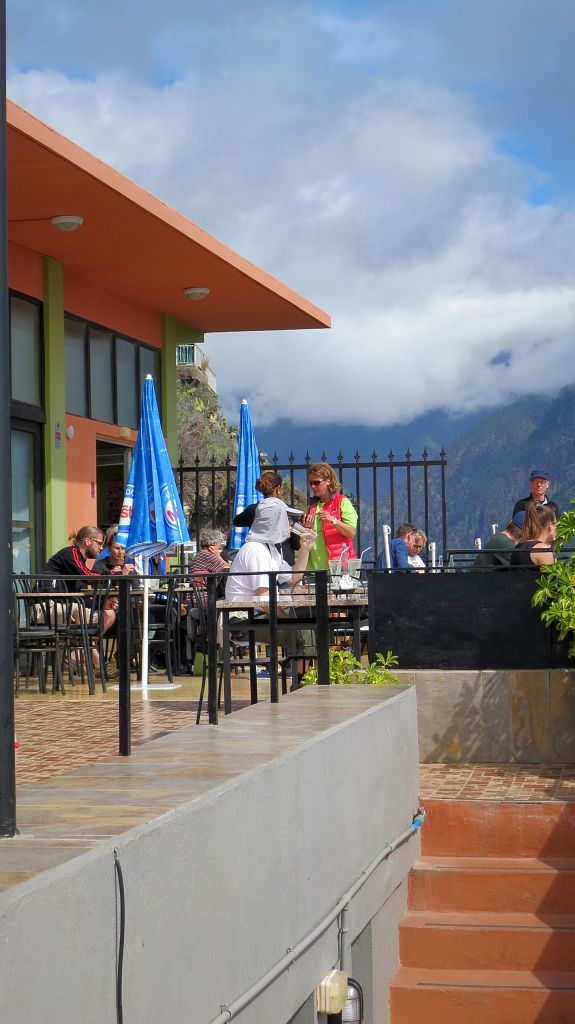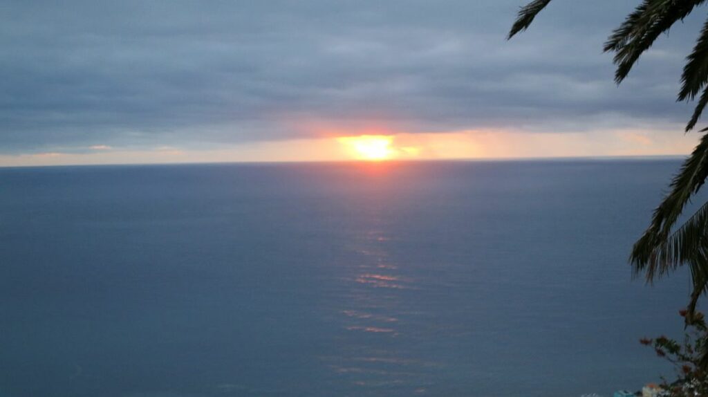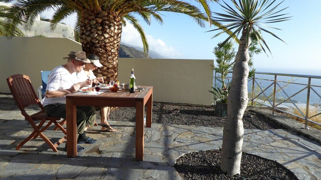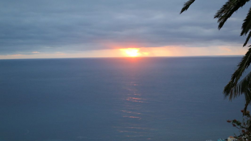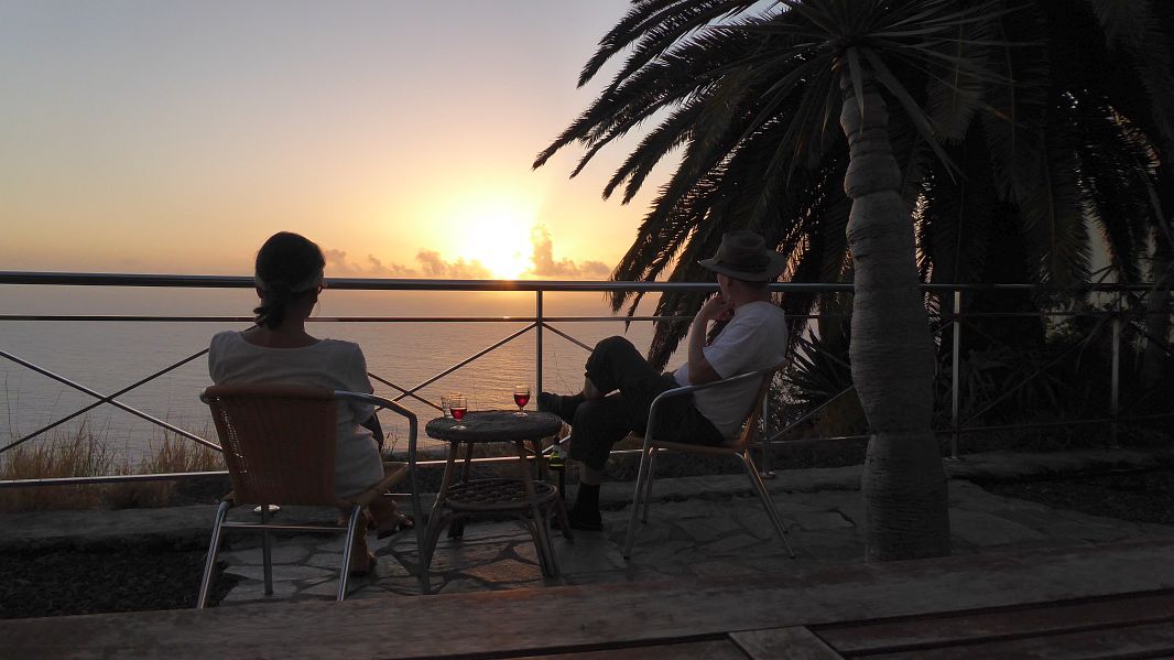 Mit ziemlich wackligen Knien kommen wir dann irgendwann wieder unten an, während sich der Himmel langsam bewölkt, was hier eher ungewöhnlich ist. Nach einem Abendessen in der Fischkneipe von El Remo gibts dann noch einen Absacker auf der Terrasse… und der Himmel hat sich schon so weit zugezogen, daß die Sonne nur noch ganz kurz rausschauen kann.