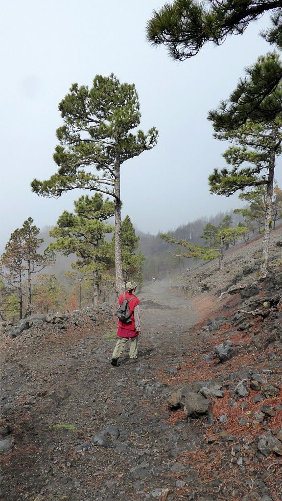 Gemäß Wetterbericht soll es heute zwar teils bewölkt, aber regenfrei bleiben, weshalb wir erwägen, ein Stück Vulkanroute zu gehen. Der Blick auf die Cumbre ist zwar nicht wirklich ermutigend, andererseits haben wir es aber auch schon häufig angetroffen, daß sich der Bergrücken am frühen Vormittag noch in Nebel oder Wolken hüllt, gegen Mittag die Sonne es aber dann doch schafft, alles freizubrennen. Also fahren wir optimistisch zum Refugio El Pilar, wo die Route startet… dort sind es nur 10° und ich habe nur ein Hemd dabei. Nach kurzer Überlegung wagen wir es dann aber doch und wandern durch den leichten Nebel der Cascada nach oben.