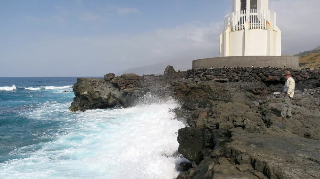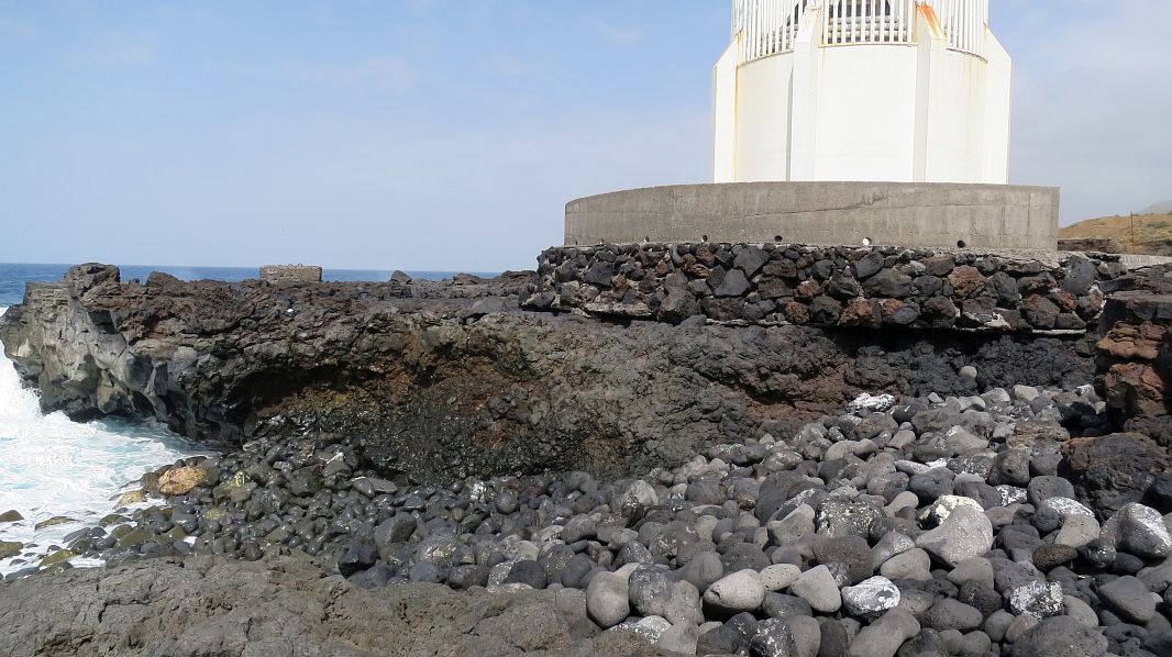 Allerdings hatte man die Festigkeit des neu entstandenen Gesteins wohl überschätzt, als man 1993 den neuen Leuchtturm dort auf ein Betonfundament stellte. Damals konnten wir noch komplett drumherum laufen, inzwischen hat das Meer aber immer mehr Lava abgeknabbert und und eine Bucht erzeugt, die bereits unmittelbr bis an das Turmfundament reicht. Lange wird der doch kaum 25 Jahre junge Turm deshalb dort wohl nicht mehr stehen können.
