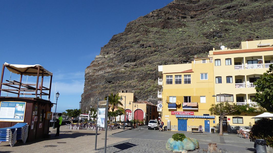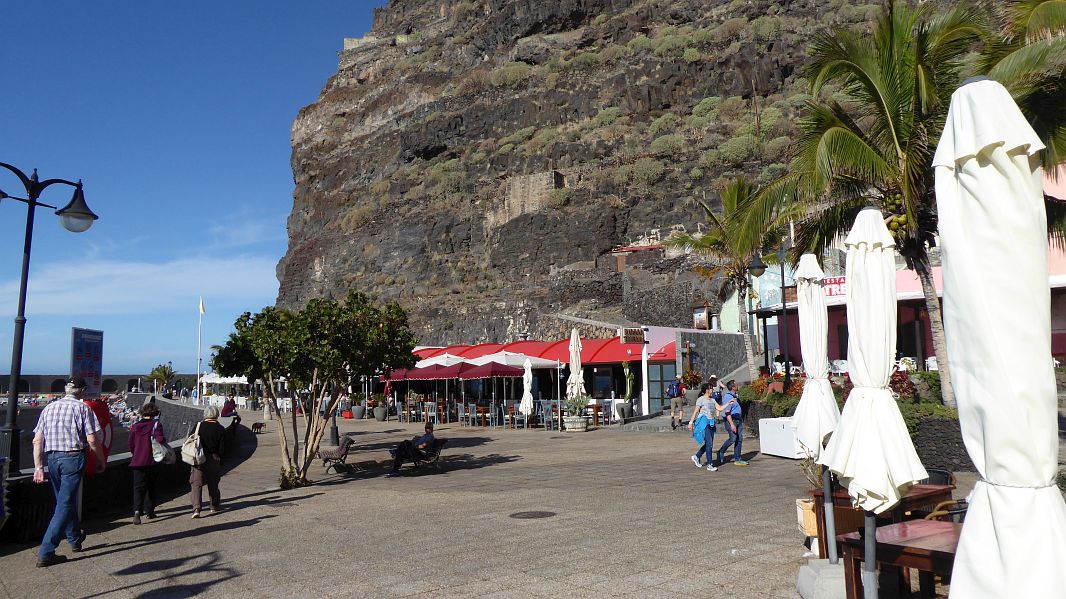 Heute erster Wanderversuch an unserer Standard-Teststrecke, die in Puerto Tazacorte startet. Noch ist an den Fischlokalen nichts los, zwischen denen der Weg nach oben beginnt.
