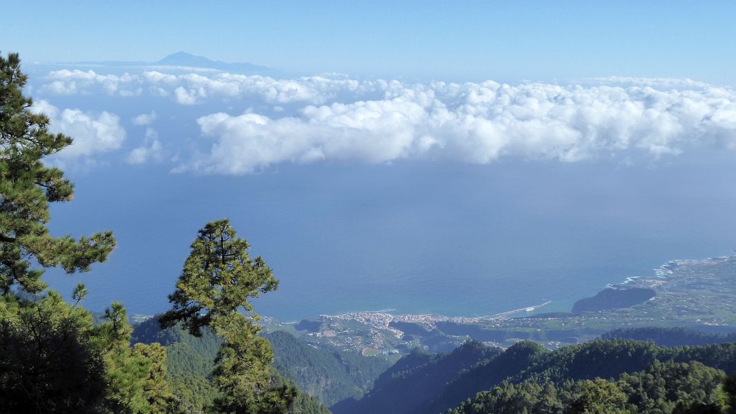 Als wir unseren finalen Rastplatz erreichen, bietet sich unten der Blick auf die Inselhauptstadt und über den Wolken ist Spaniens höchster Berg, der Teide der Nachbarinsel Teneriffa zu sehen.