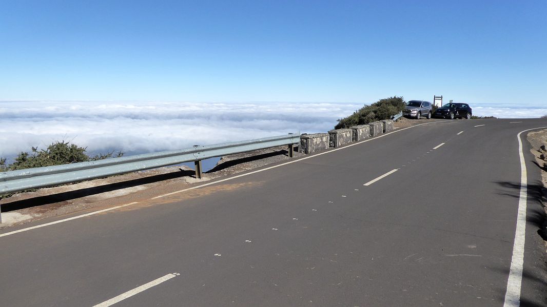 Ursprünglich wollten wir heute über die Vulkanroute laufen, als wir uns El Paso nähern, sehen wir aber, daß dort dichte Bewölkung aufzieht, weshalb wir uns umentscheiden und über Tijarafe Richtung Roque de los Muchachos fahren. Wir suchen uns eine Parkmöglichkeit über den Wolken und ziehen die Wanderschuhe an.