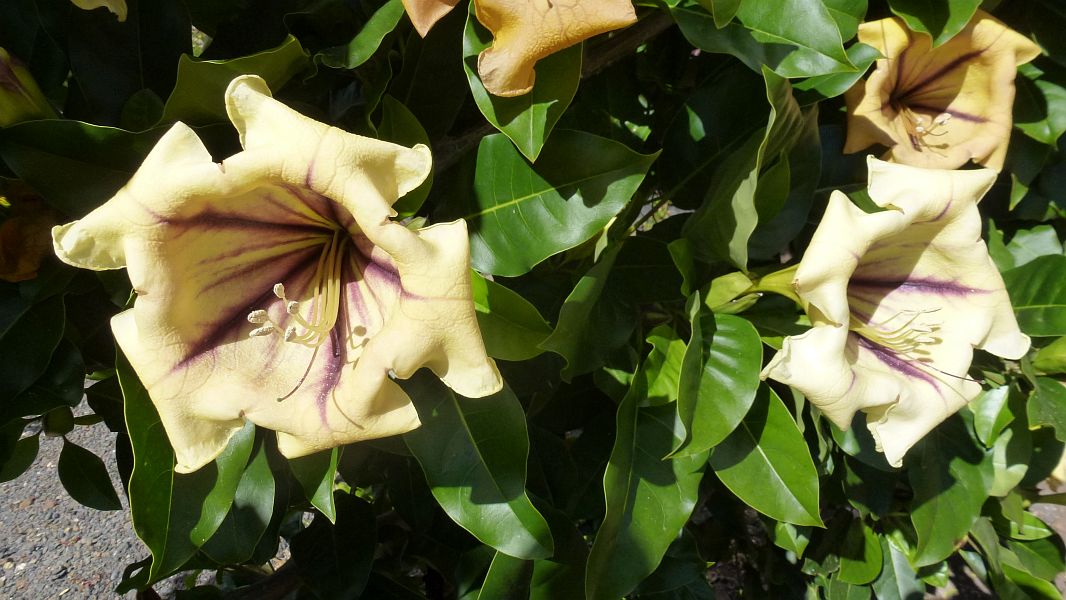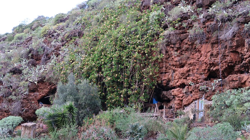 Der Wanderweg führt ebenfalls hinunter in einen Barranco, an dessen Steilwand sich ein riesiger Goldkelchwein (solandra) vor noch bewohnten Höhlen angesiedelt hat.