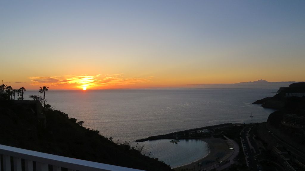 Dieses Puerto Rico ist mit Abstand eine der häßlichsten Betonsünden, die der spanische Tourismus hervorgebracht hat, aber jetzt sind wir mal hier und beabsichtigen nicht, allzu viel Zeit „zu Hause“ zu verbringen. Ein Spaziergang zum Strand, der mit Dutzenden von Lokalen gesäumt ist, deren Schlepper die Touristen mehr oder weniger aggressiv an ihre Tische quatschen wollen… Wir sind zu kaputt von diesem Streßtag um uns lange zu wehren und lassen uns zu einem gegrillten Fisch überreden, der uns mit je einem Getränk dann 60€ kostet. Der Sonnenuntergang mit dem Blick auf den Teide vom benachbarten Teneriffa ist das erste Highlight des Tages, dann geht es früh ins Bett, jetzt heißt es erstmal: ausschlafen!