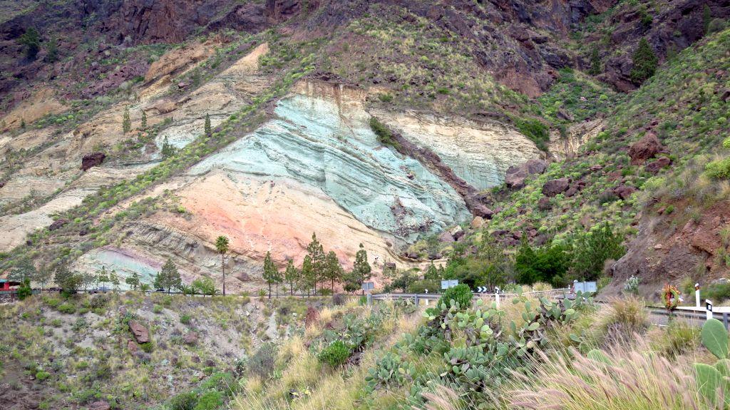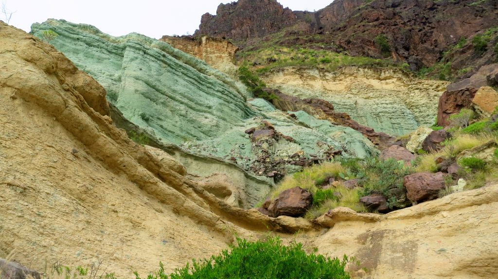 Nach dem beschwerlichen Abstieg fahren wir vorbei an Kupferoxyd-grünen Felsen…